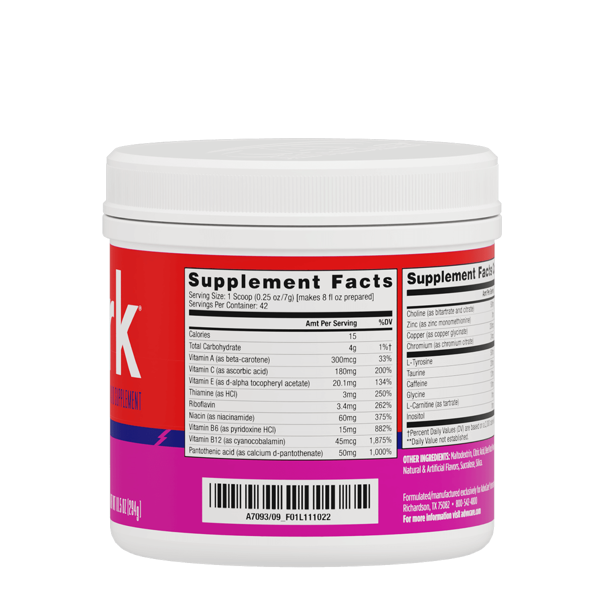 Spark® is a unique blend of 20 vitamins, minerals and nutrients that work synergistically to provide a healthy and balanced source of energy.* Spark contains an effective amount of caffeine to give you a quick boost, B vitamins to enhance your body's natural ability to produce and sustain its own energy, and neuroactive ingredients that enhance mental focus and alertness.*