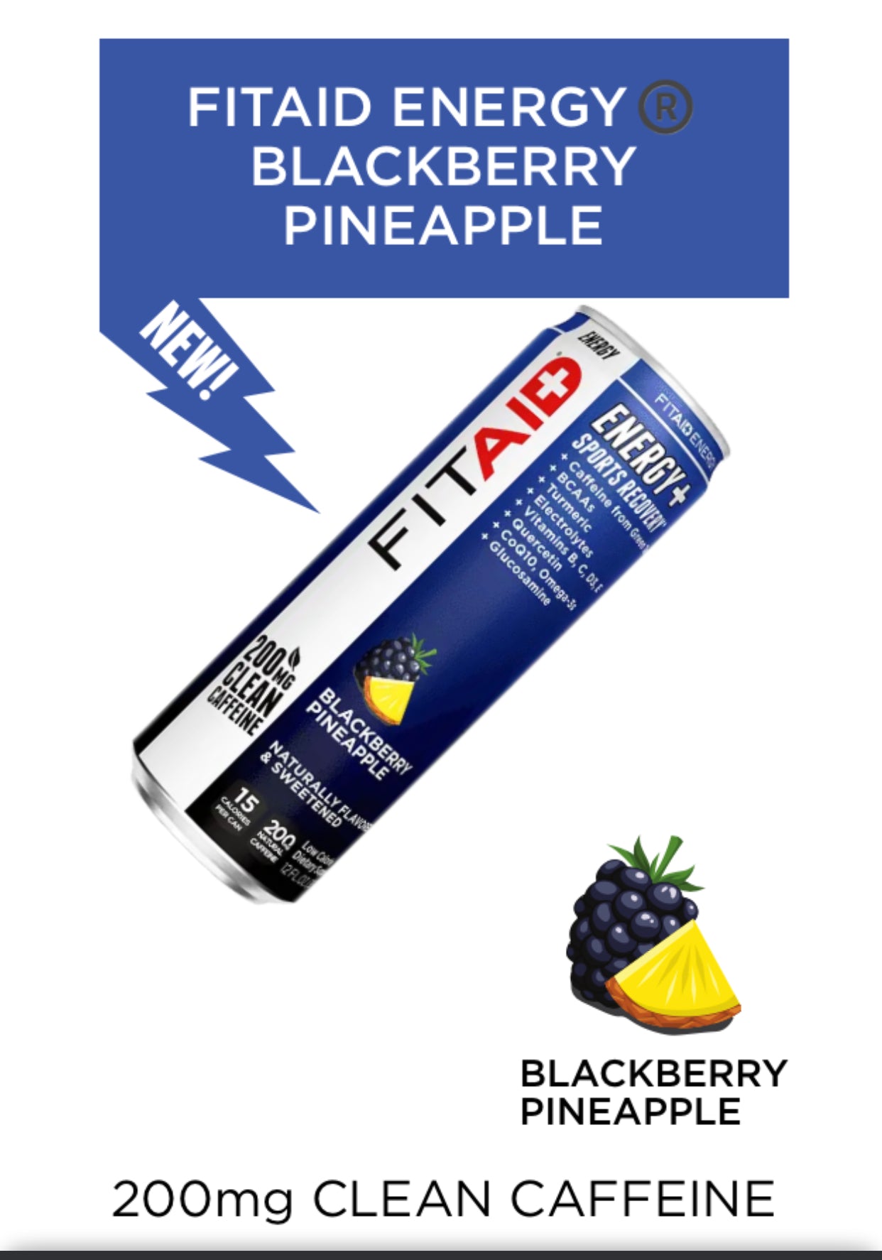 FITAID Energy®️ Clean Energy + Sports Recovery. The performance energy drink for athletes boosted with 200mg of clean caffeine from green tea. FITAID Energy Blackberry Pineapple is naturally flavored with a bright, bold, and tart taste that will remind you of windsurfing to shore, with flavors of juicy bold berry notes and slightly tangy sweet pineapple.