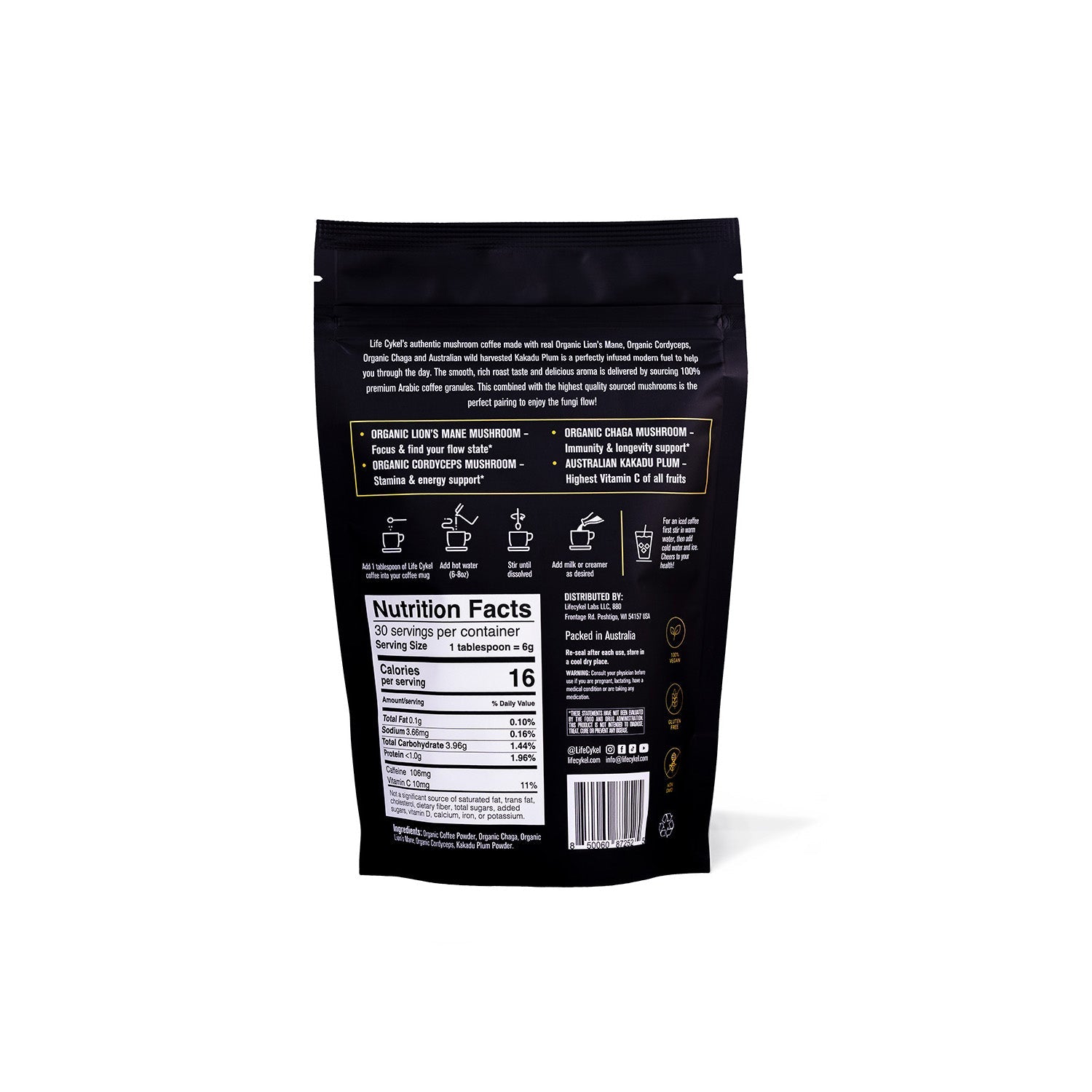 Organic Coffee Powder, Organic Chaga, Organic Lion's Mane, Organic Cordyceps, Kakadu Plum Powder.